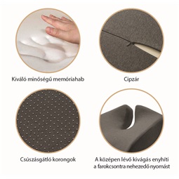 A kiváló minőségű memóriahab felhasználásával készült ergonomikus kialakítású párna segít elkerülni, illetve enyhíteni a deréktájon keletkező nyomást, az ülés következtében kialakuló derék-, illetve hátfájást.